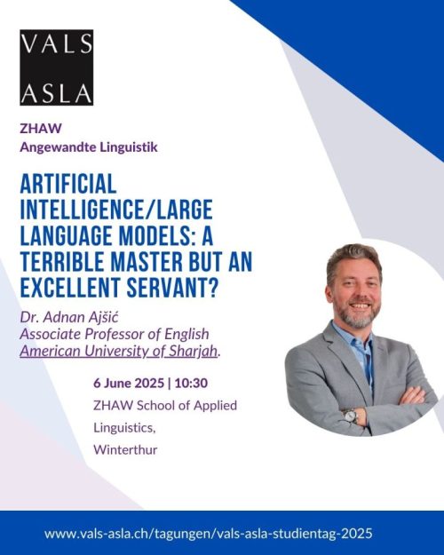 Ajšić, A. (2025, June). Artificial intelligence/large language models: A terrible master but an excellent servant? Paper presented at the ZHAW Symposium of the Swiss Association for Applied Linguistics (VALS-ASLA): Creativity meets technology – Applied Linguistics at the interface of artificial and human intelligence, Winterthur, Switzerland.