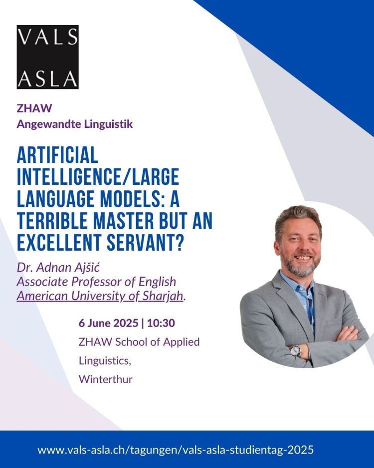 Ajšić, A. (2025, June). Artificial intelligence/large language models: A terrible master but an excellent servant? Paper presented at the ZHAW Symposium of the Swiss Association for Applied Linguistics (VALS-ASLA): Creativity meets technology – Applied Linguistics at the interface of artificial and human intelligence, Winterthur, Switzerland.